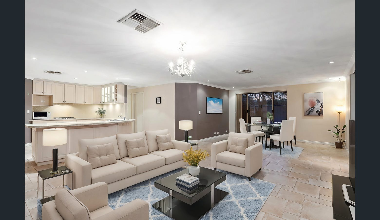 * Open plan kitchen/family/dining area flowing seamlessly to the minor bedrooms