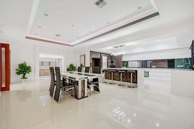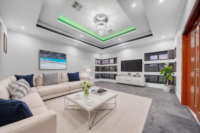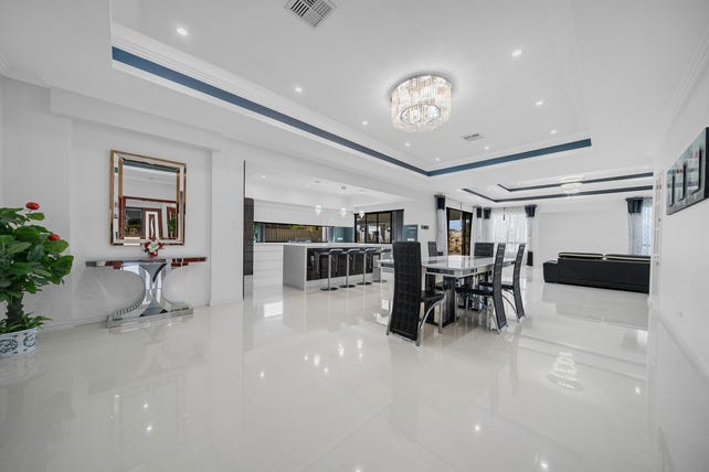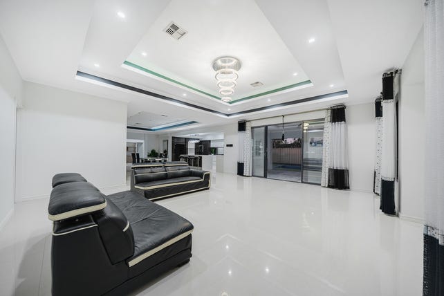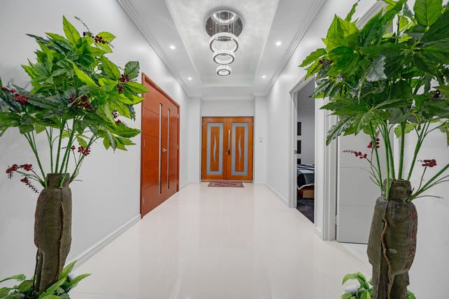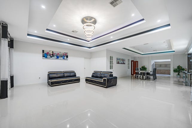 Step inside the inviting double doors into a wide entry hall framed by recess ceilings and chandeliers welcoming you to the home. The formal lounge is a statement in grace and size, with coffered ceilings and an affluent chandelier to complete it.