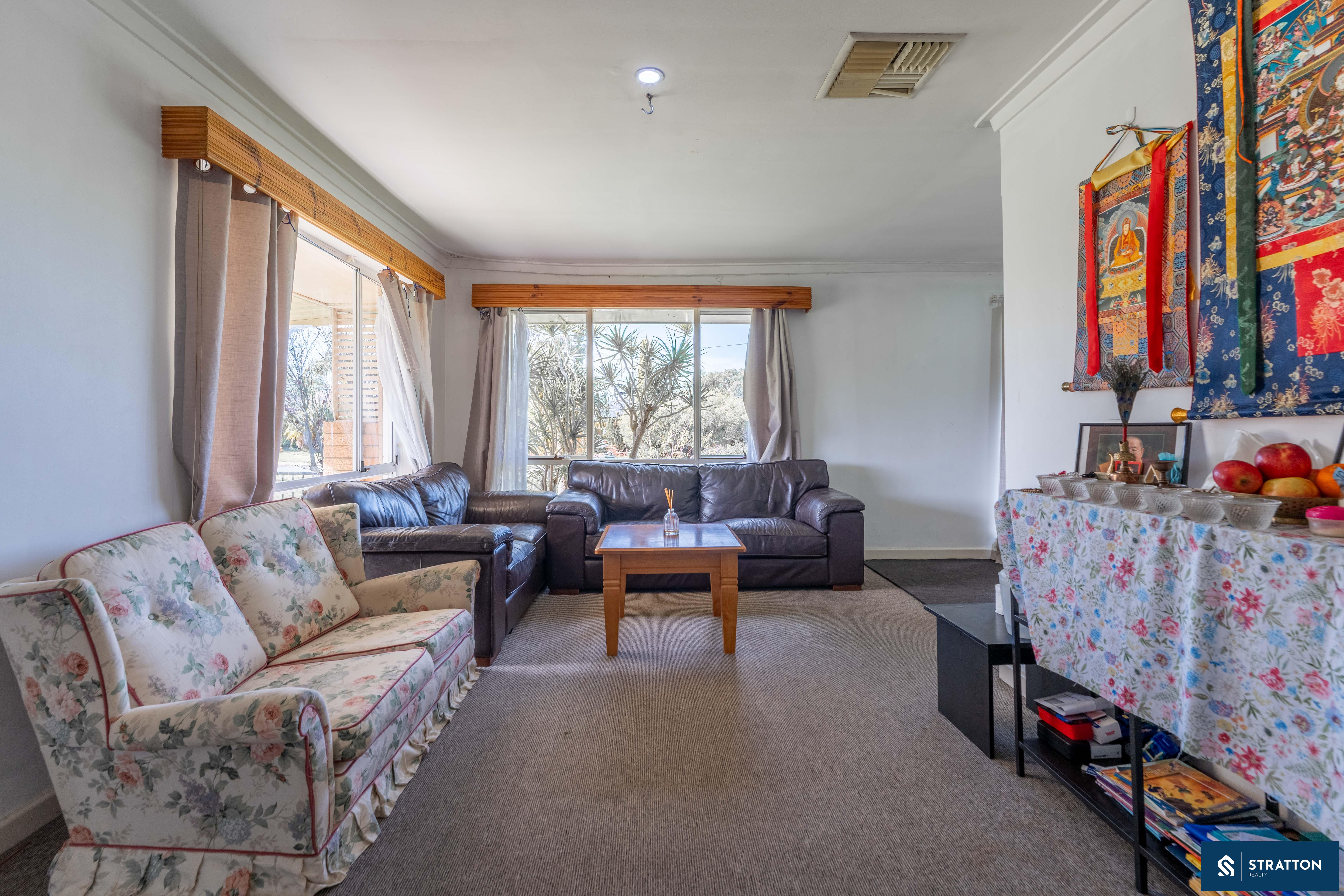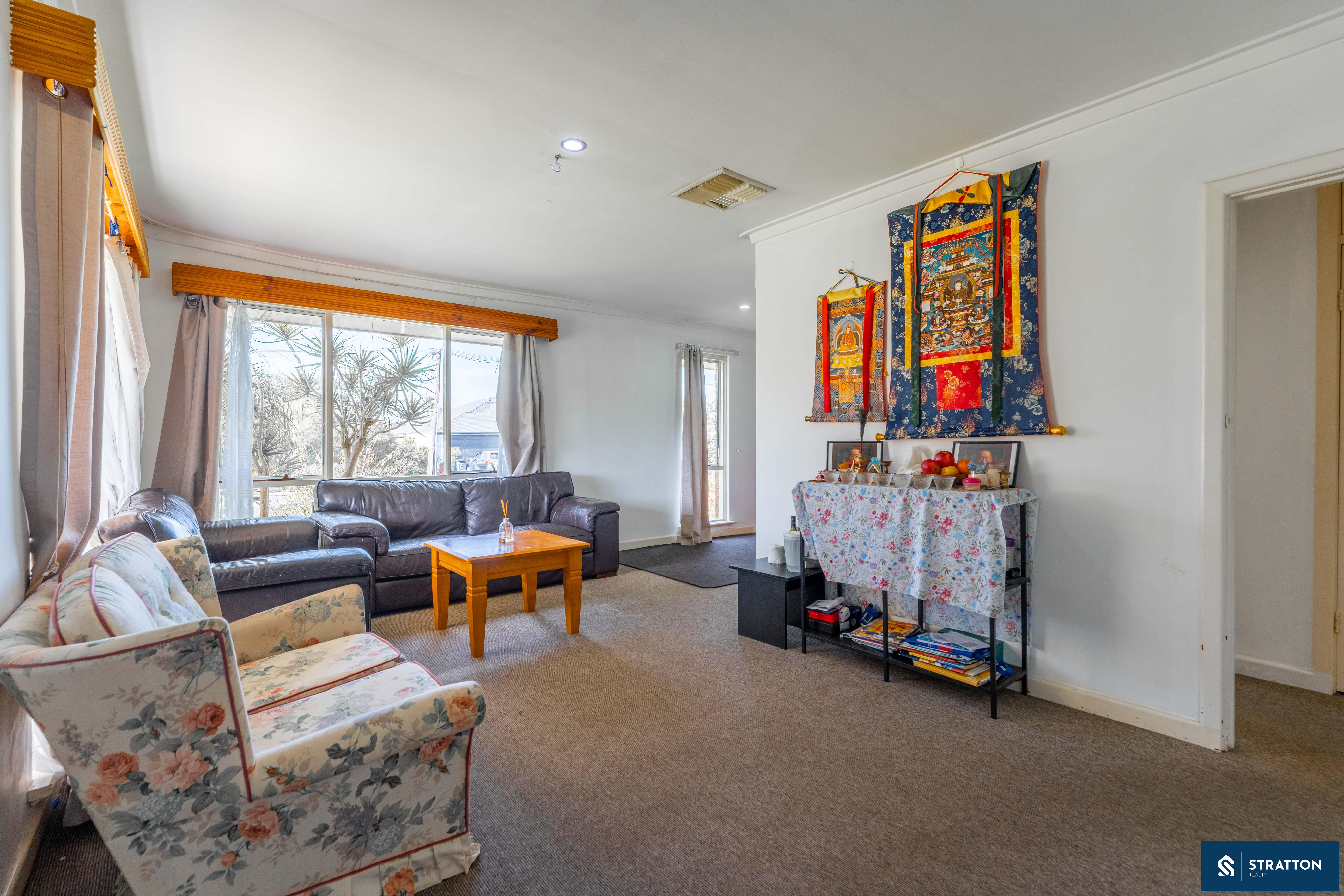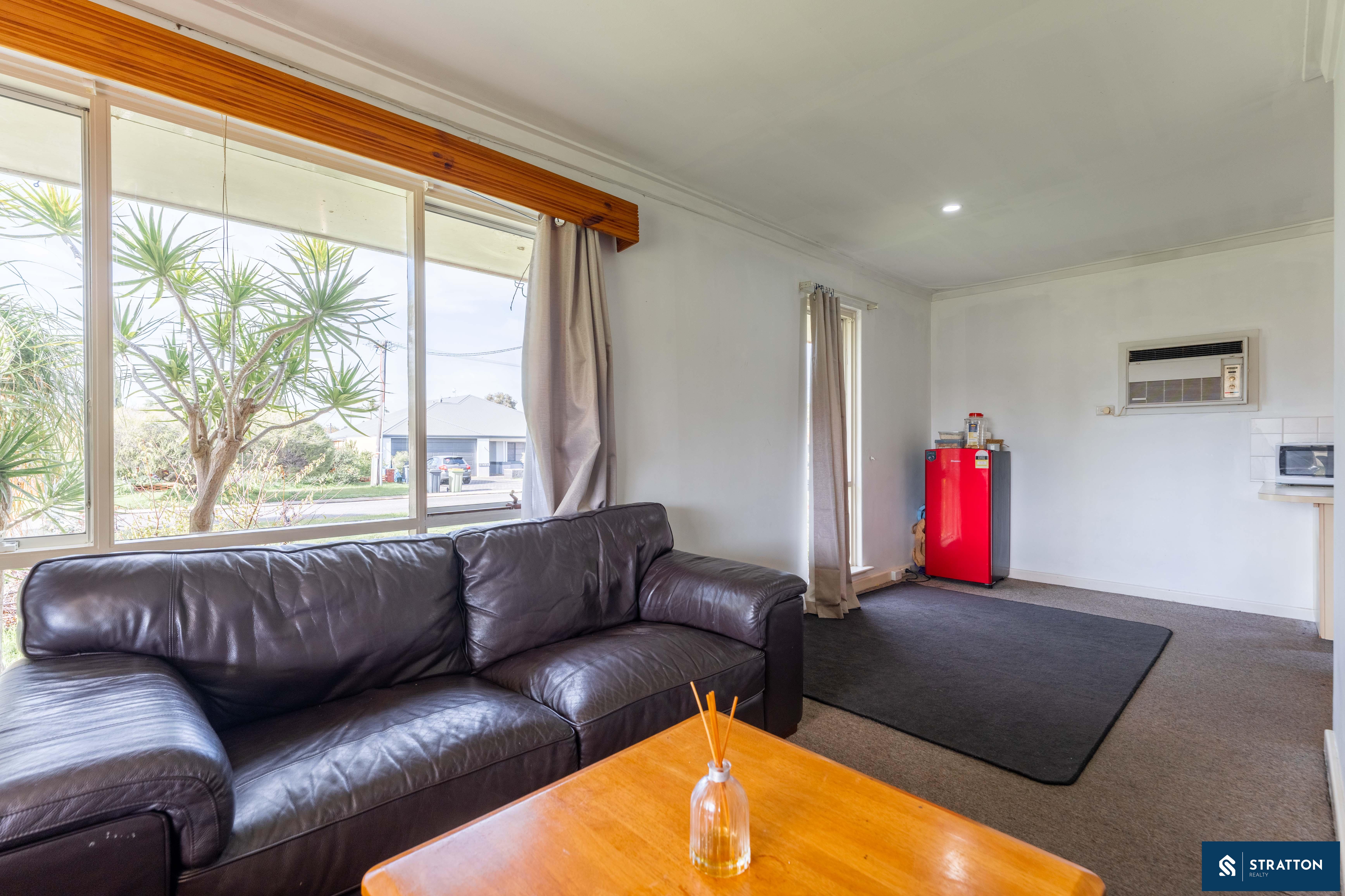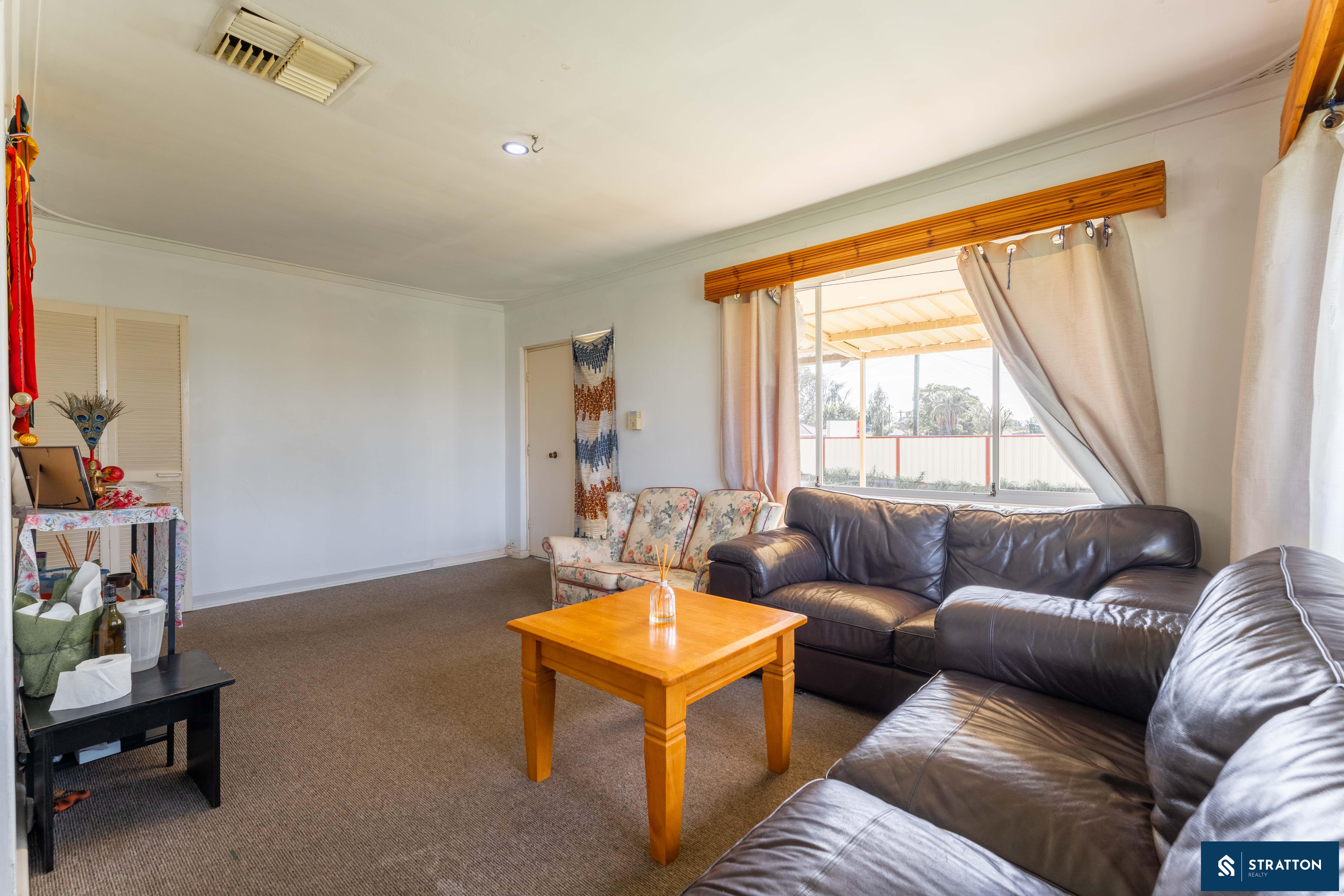 The home welcomes you with a front sunroom or enclosed patio area, perfect for enjoying morning coffee or relaxing in the evening. Inside, the carpeted living area boasts a wall-mounted air conditioner and a large window that floods the space with natural light. The house is equipped with evaporative air conditioning and LED downlights throughout, ensuring a comfortable and bright living environment.