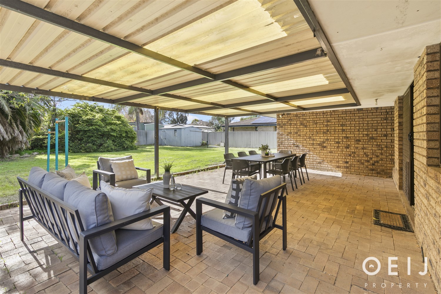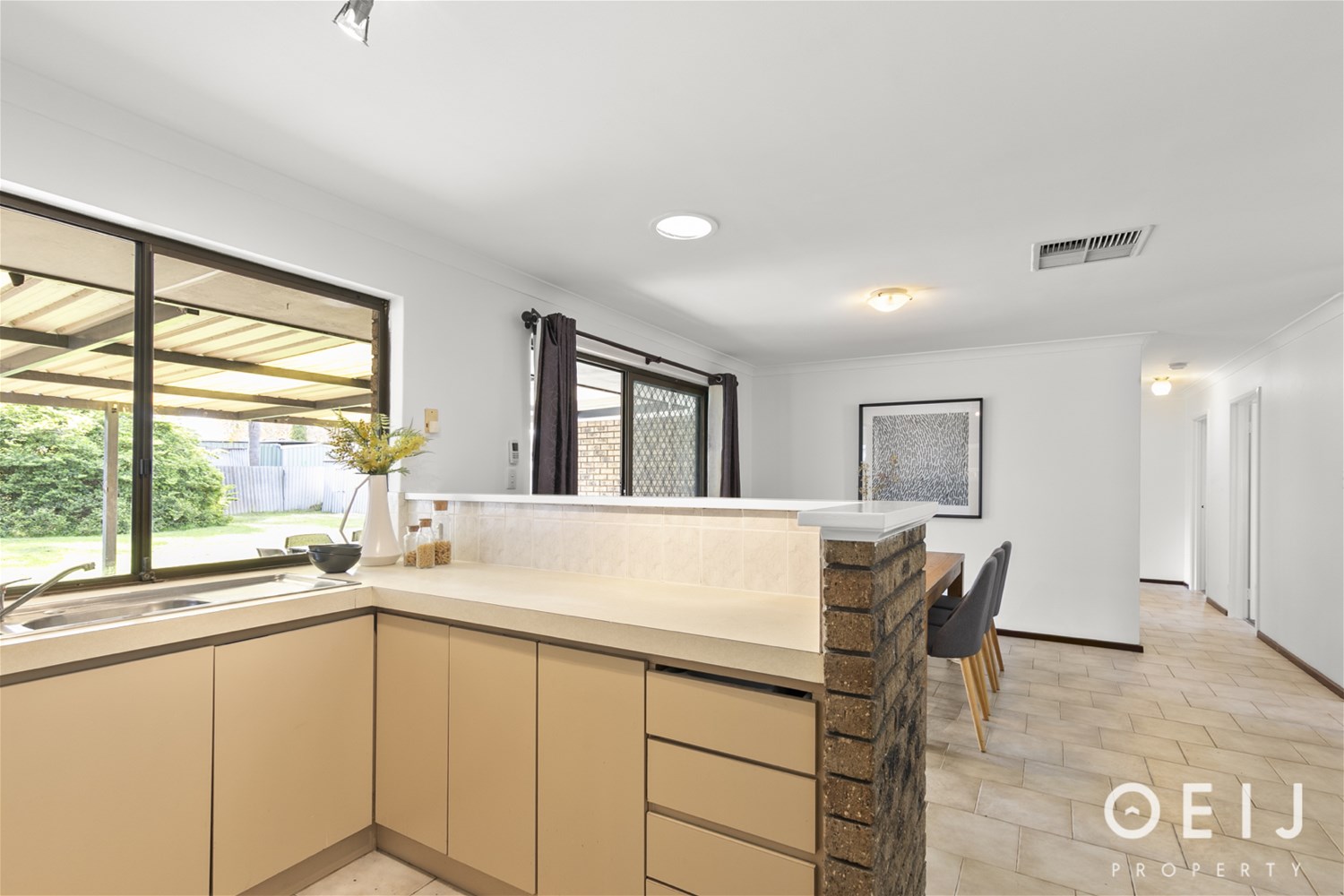 DINING AND LIVING A traditional designed home with the carpeted lounge at the front slightly separated from the tiled living and meals where everyday living is around the kitchen and outdoor patio. Well positioned kitchen with gas cooking and updated electric oven, overlooking the huge rear yard and patio natural light luminates the room. All living areas are serviced by ducted evaporative cooling and the home is freshly painted throughout. With two suitable living spaces find a purpose for each area within your family.